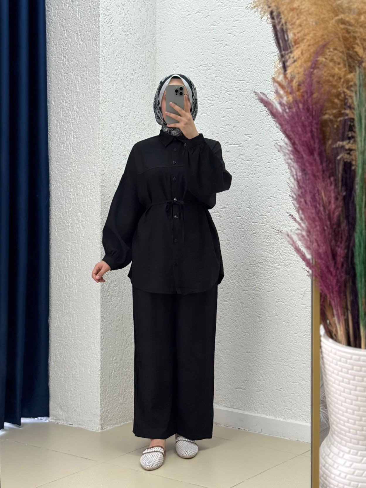 Kadın Tesettür Pantolonlu Takım/Melira Önü Pervazlı Biyeli Çilek Pantolonlu Takım-MF561 Siyah