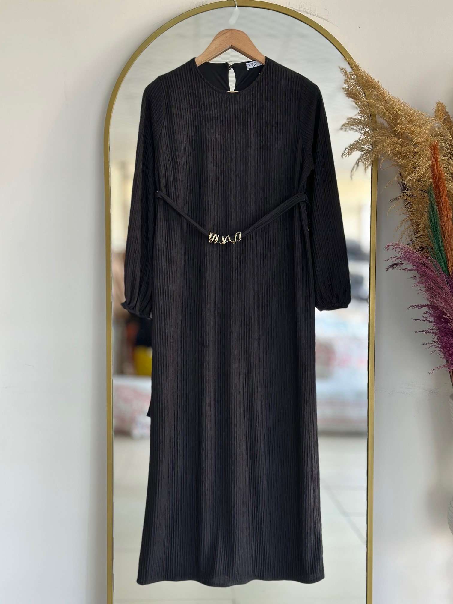 Kevser Kırışık Kumaş Elbise-BN4338 Siyah