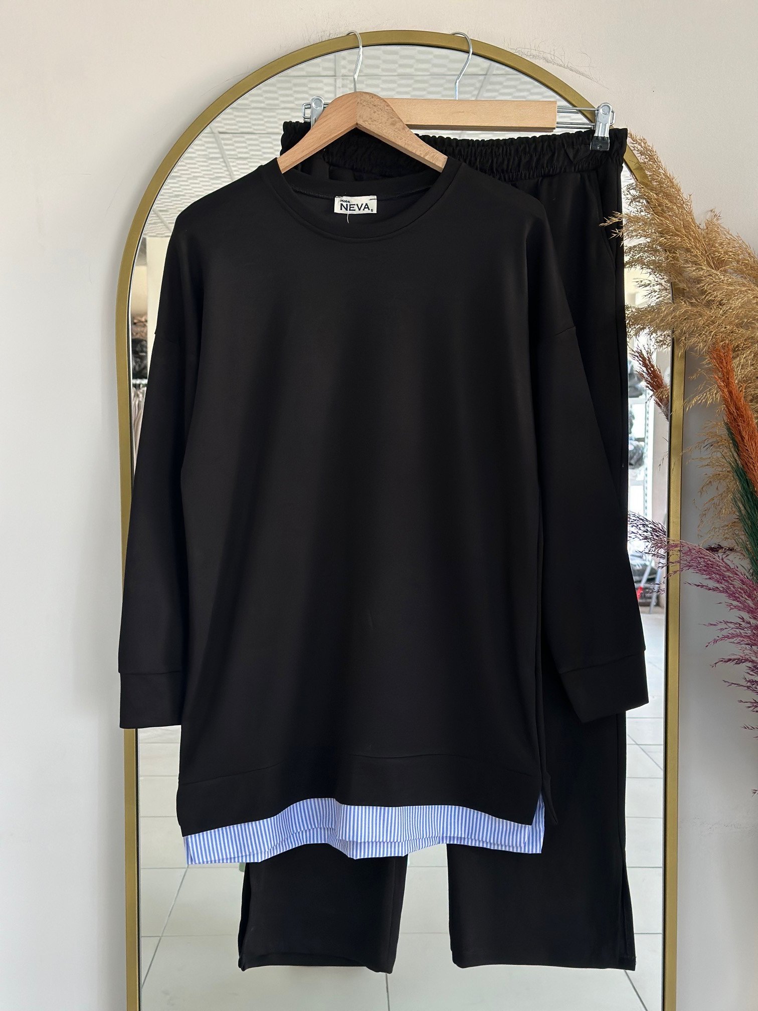 Kübra İki İp Eteği Gömlek Garnili Pantolonlu Takım-NA3368 Siyah
