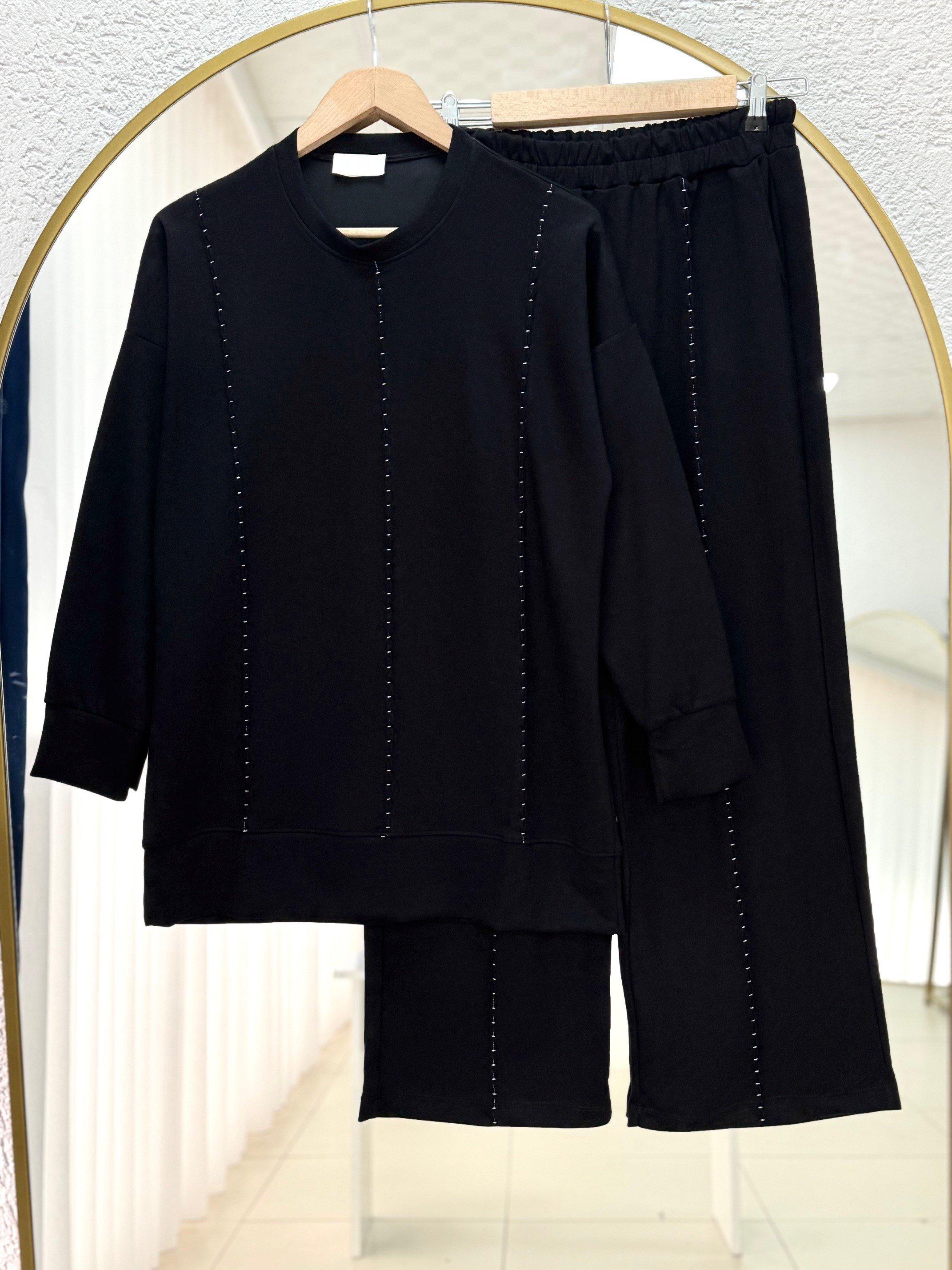 Lamuna Badem Dikiş Detay Pantolonlu Takım-NA3413 Siyah