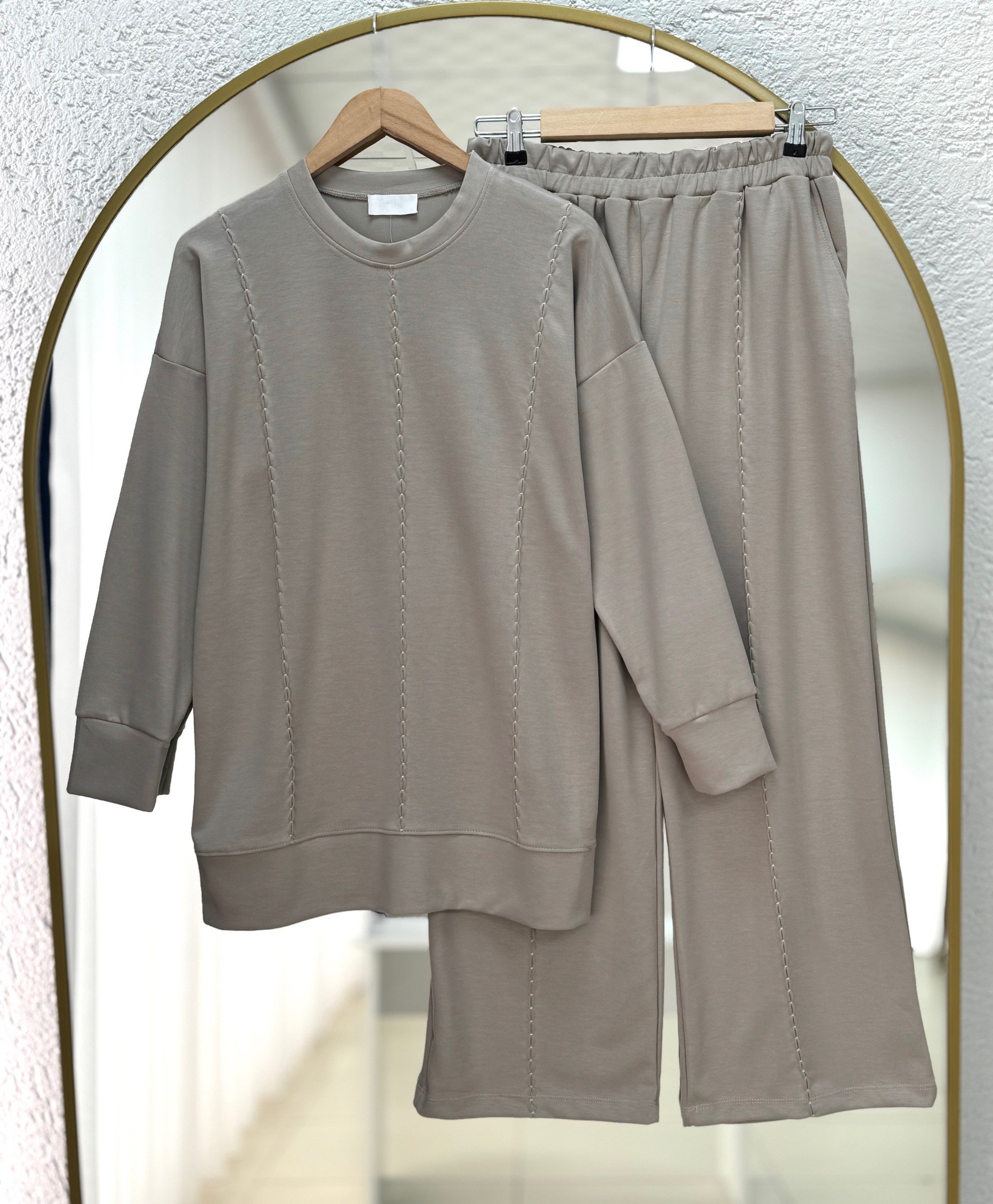 Lamuna Badem Dikiş Detay Pantolonlu Takım-NA3413 Vizon