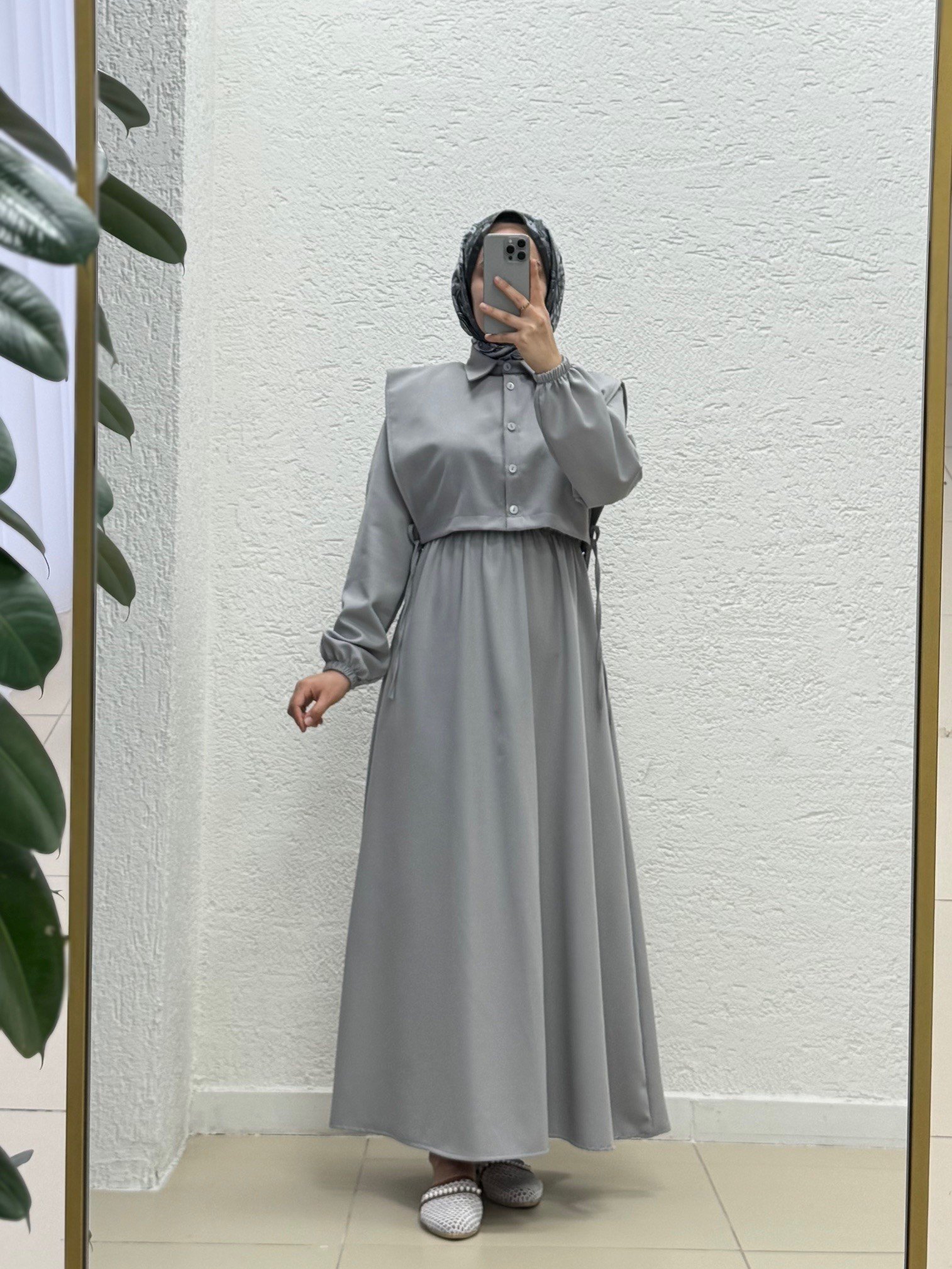Kadın Tesettür Bolerolu Elbise - Liyan Beli Lastikli Yelekli Dabıl Elbise-MF1750 Gri