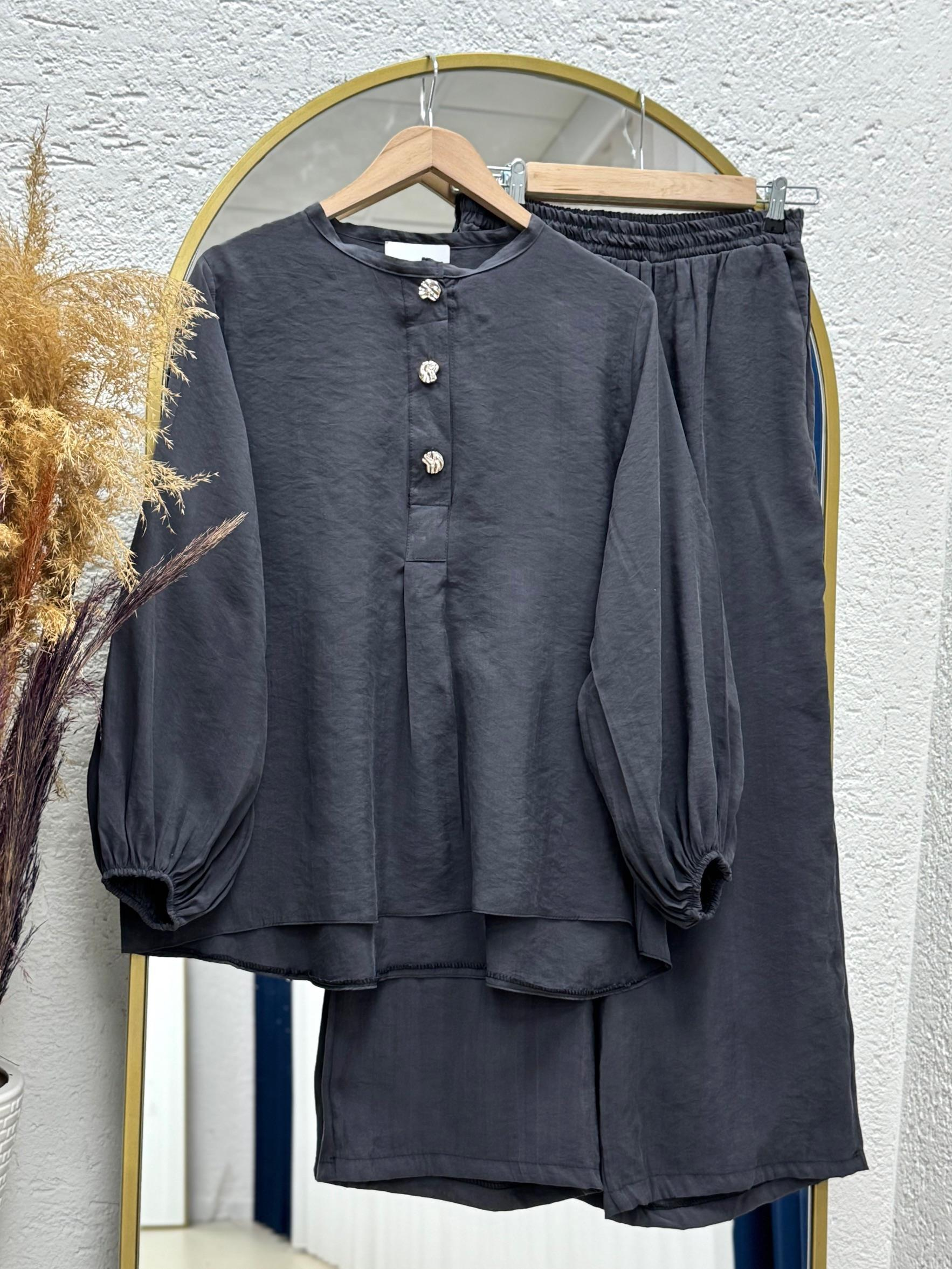Loruna Balon Kol Önü Düğmeli Modal Cupra Pantolonlu Takım-NL520 Antrasit