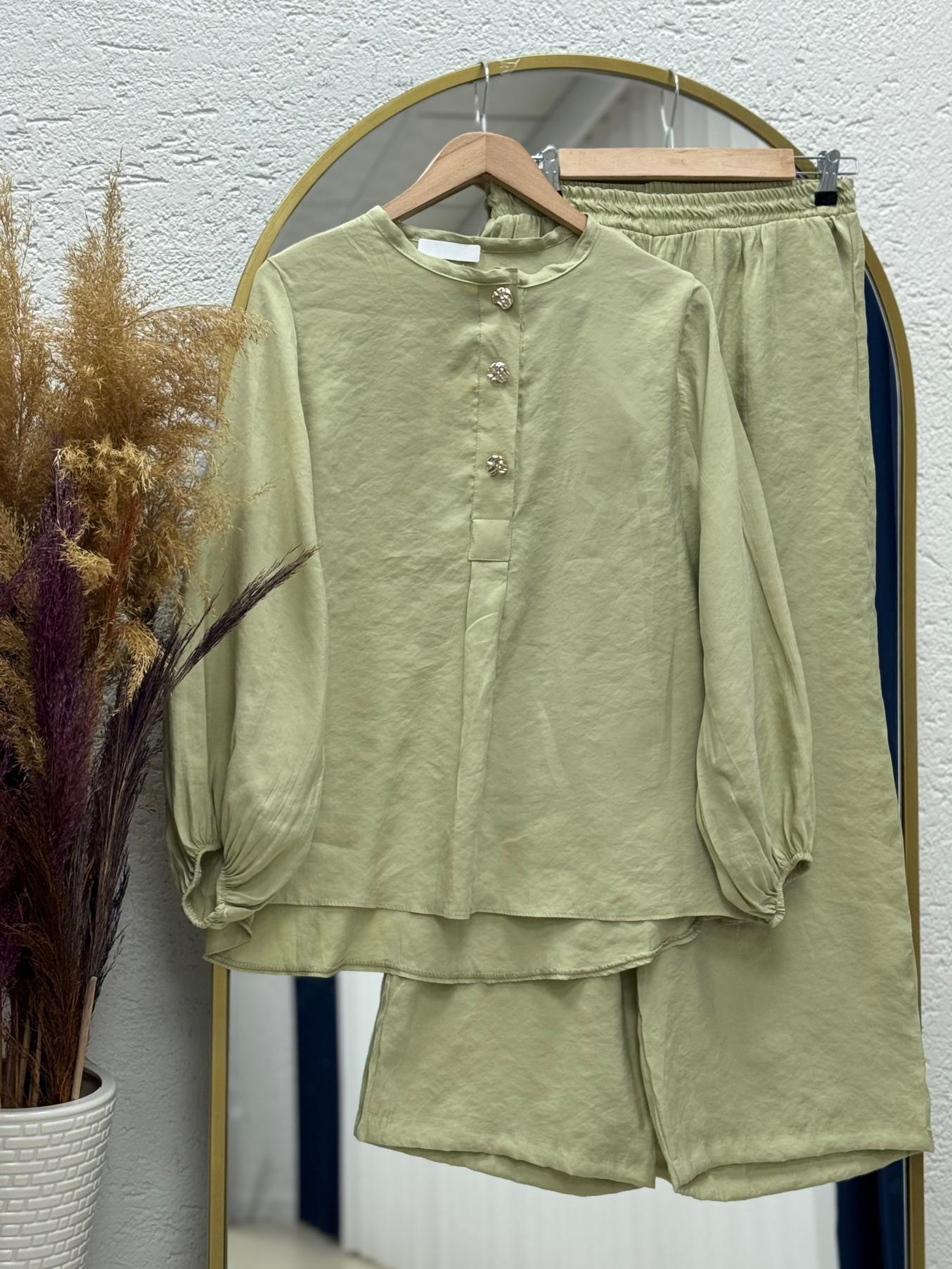 Loruna Balon Kol Önü Düğmeli Modal Cupra Pantolonlu Takım-NL520 Çağla Yeşili