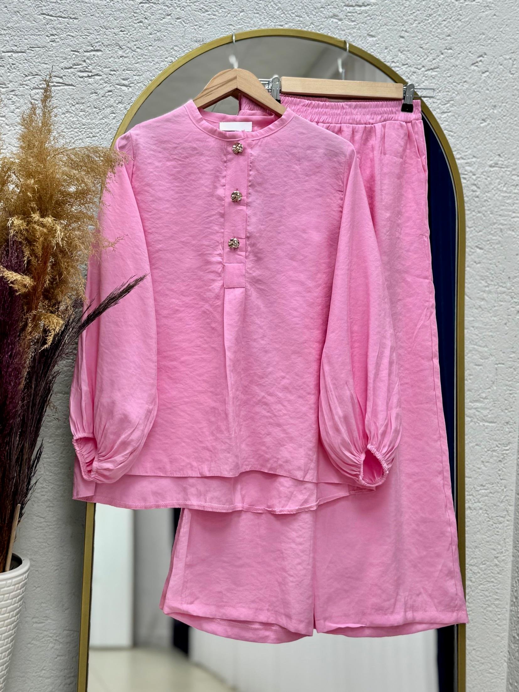 Loruna Balon Kol Önü Düğmeli Modal Cupra Pantolonlu Takım-NL520 Pembe