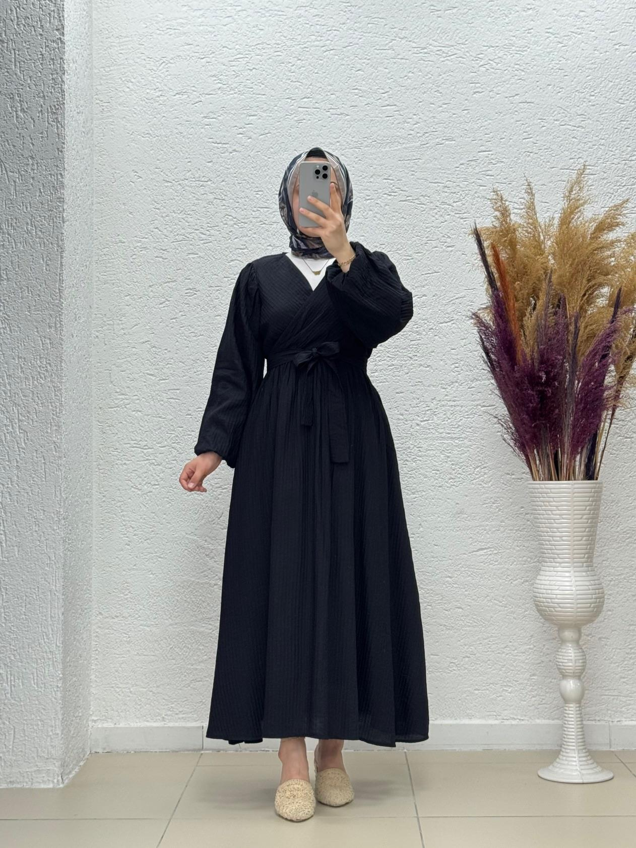 Luninda Çapraz Biyeli Kuşaklı Elbise-EK565 Siyah