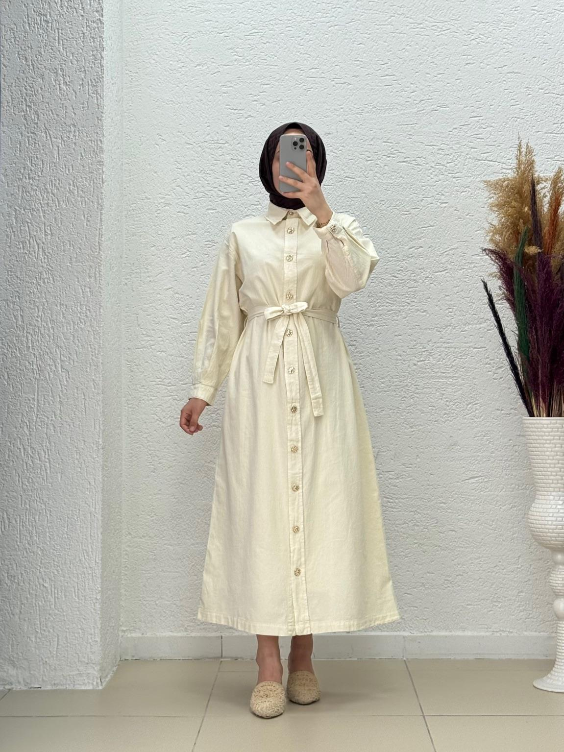 Maressa Gold Düğmeli Kemerli Keten Elbise-XE303 Taş