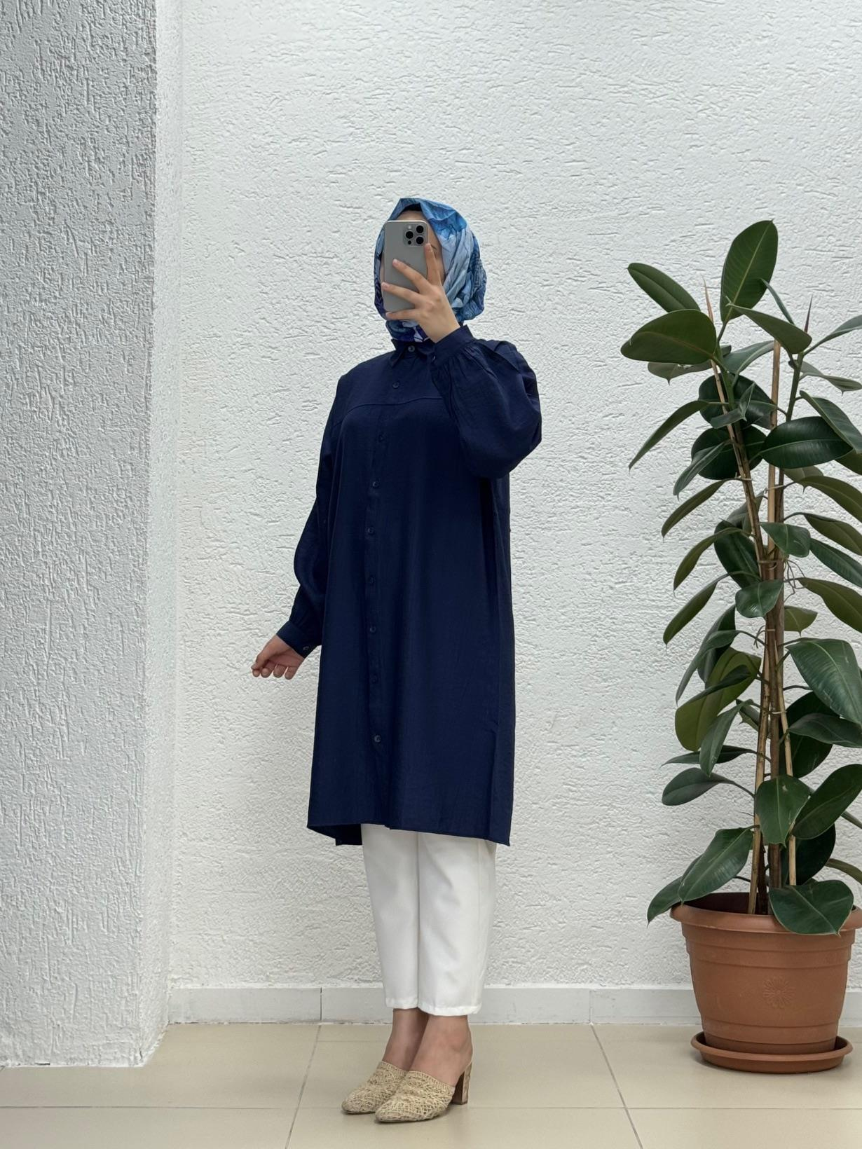 Marira Büzgülü Bağcıklı Uzun Çilek Gömlek-PE262 Lacivert