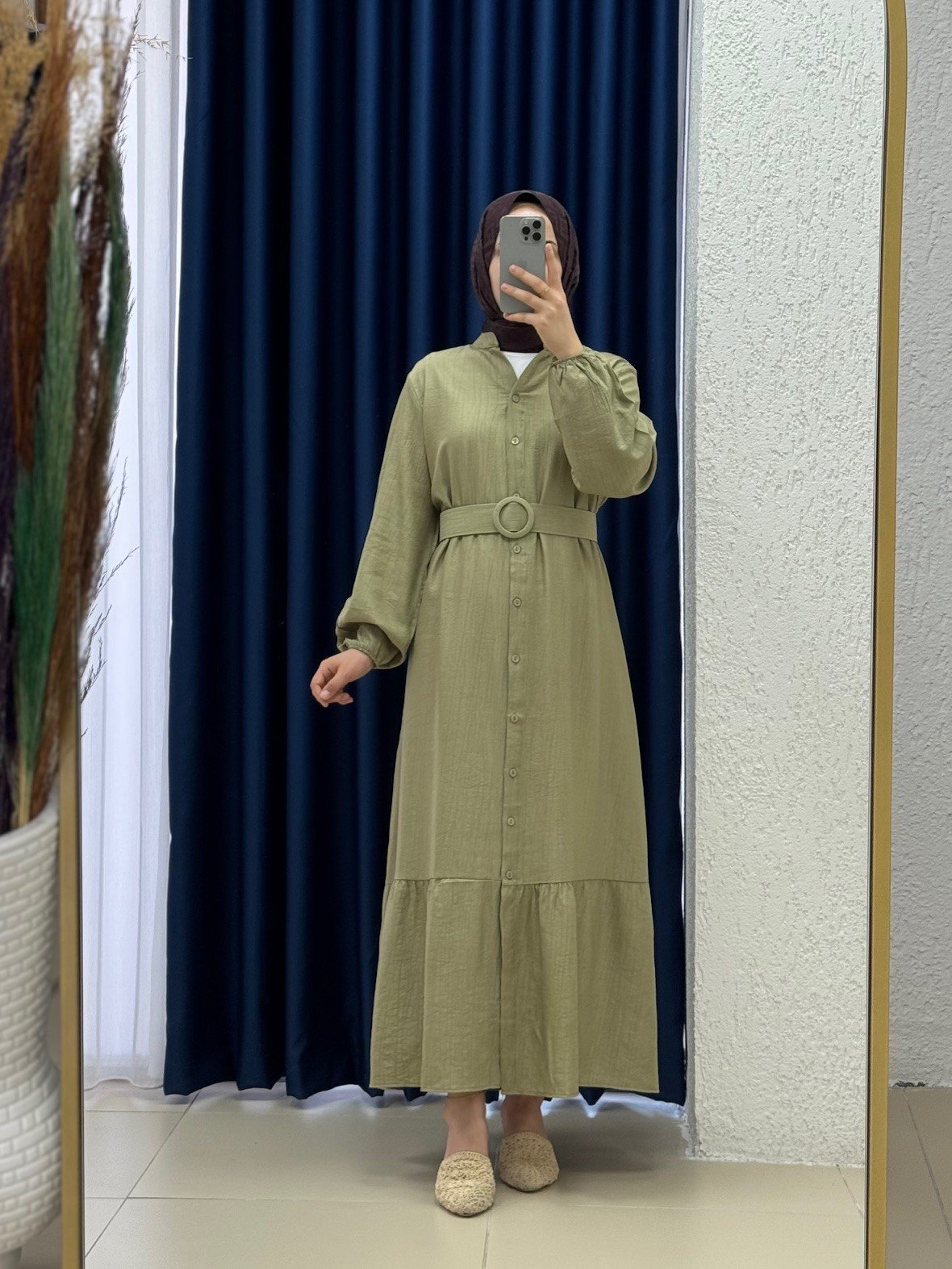 Miressa Boydan Düğmeli Kemerli Çilek Elbise-PE620 Haki