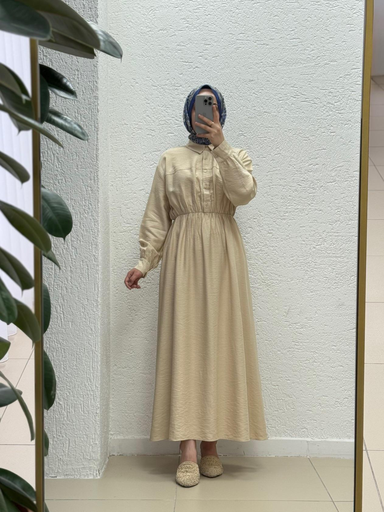 Mireva Yarım Patlı Beli Lastikli Elbise-AS4078 Bej