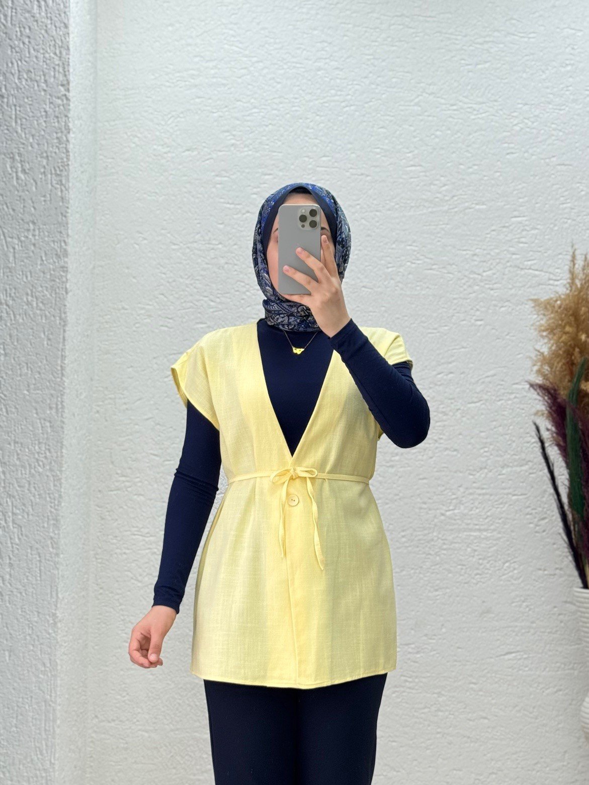 Nubonia Tek Düğmeli Keten Yelek-AS872 Sarı