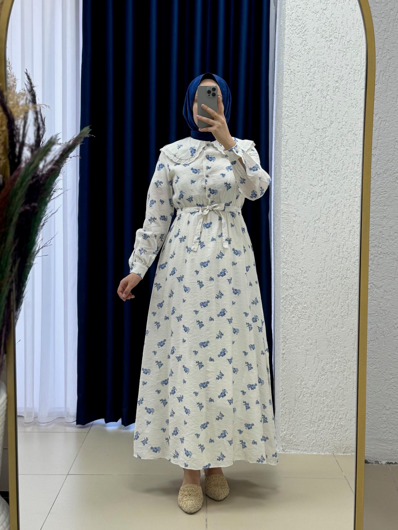 Oreledra Bebe Yaka Beli Lastikli Çiçekli Elbise-AY8650 Mavi