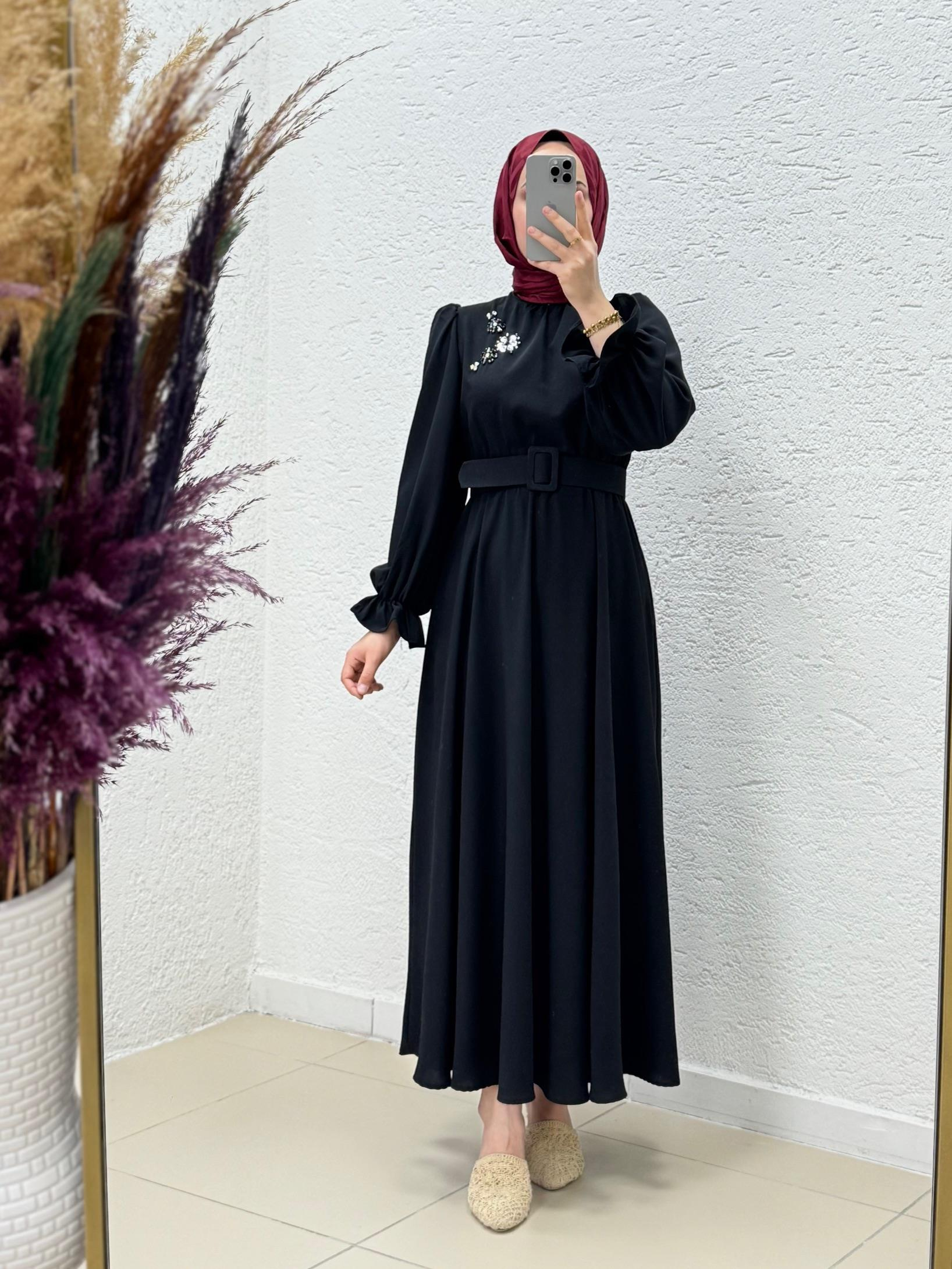 Orelesia Bel ve Kol Lastikli Bronşlu Twil Elbise-EK1144 Siyah