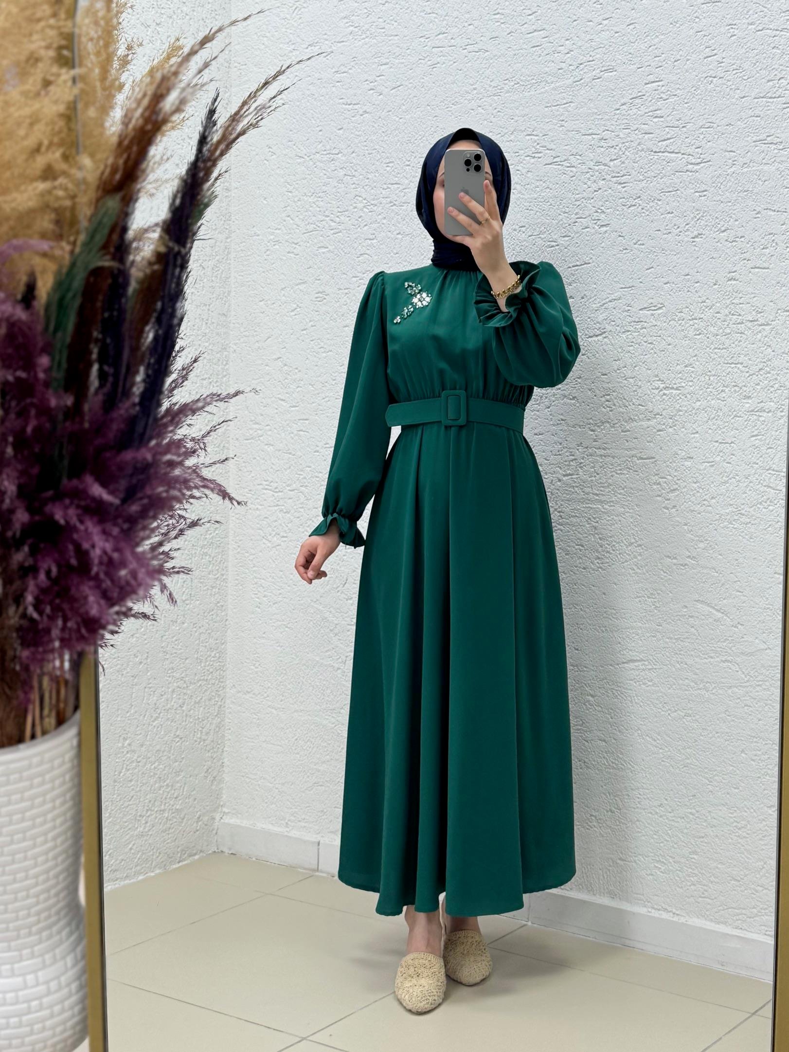 Orelesia Bel ve Kol Lastikli Bronşlu Twil Elbise-EK1144 Zümrüt Yeşili