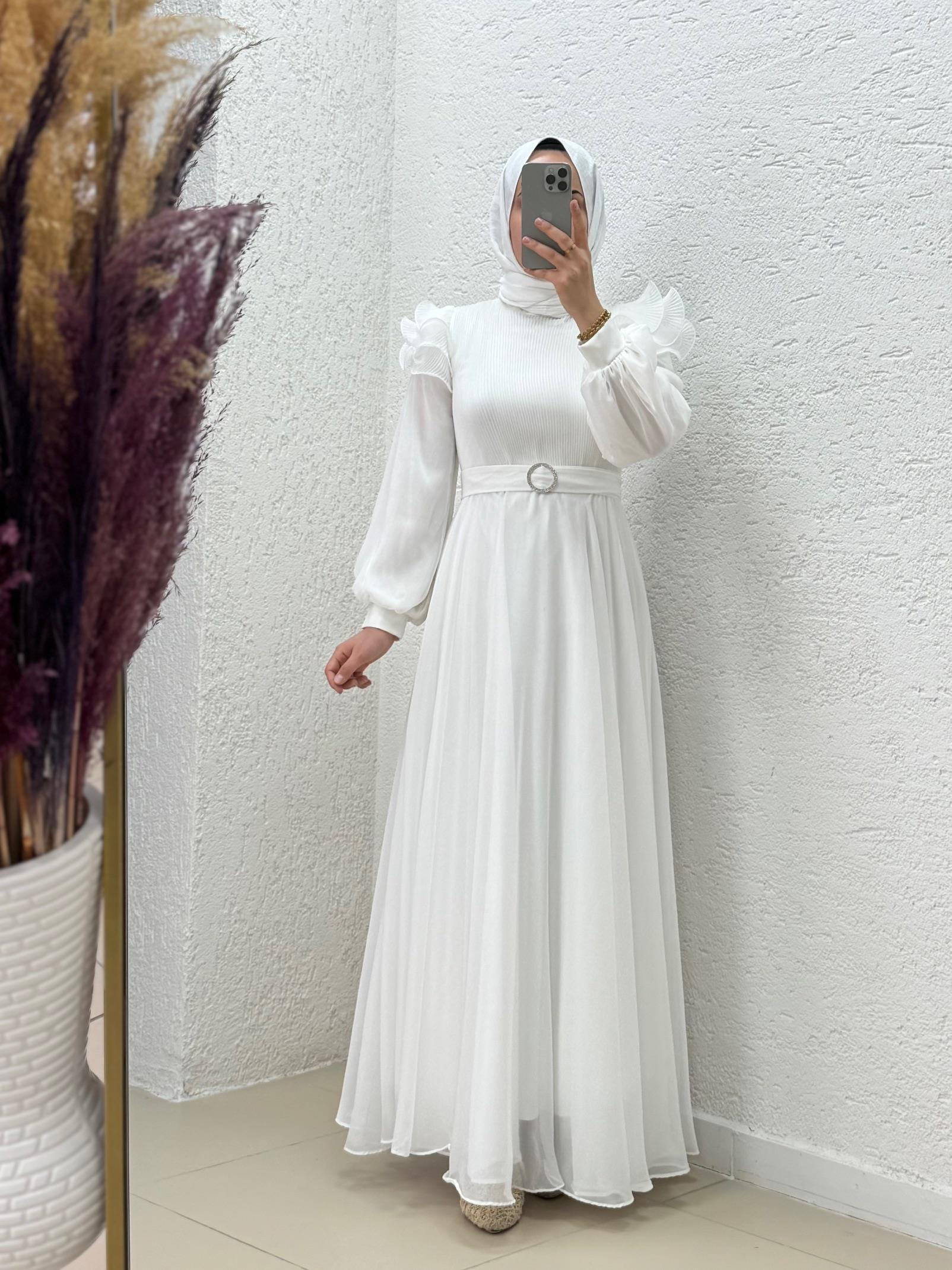 Oreleva Omuz Fırfırlı Göğüs Kısmı Pileli Tüllü Elbise-PA9596 Beyaz