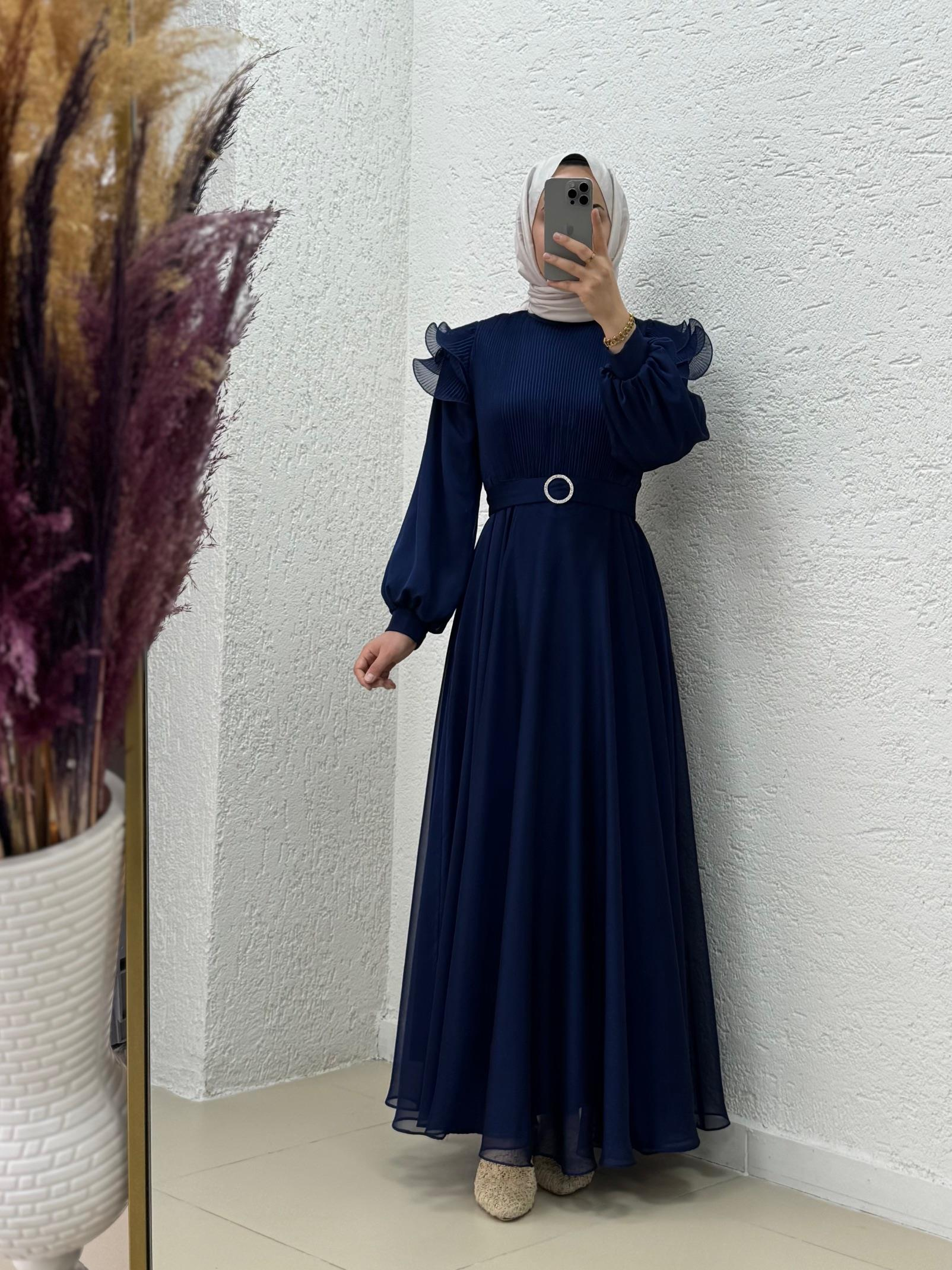 Oreleva Omuz Fırfırlı Göğüs Kısmı Pileli Tüllü Elbise-PA9596 Lacivert