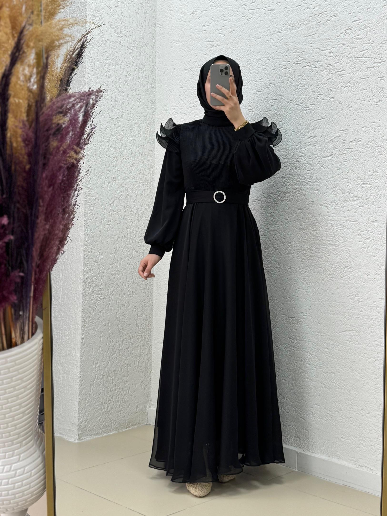 Oreleva Omuz Fırfırlı Göğüs Kısmı Pileli Tüllü Elbise-PA9596 Siyah