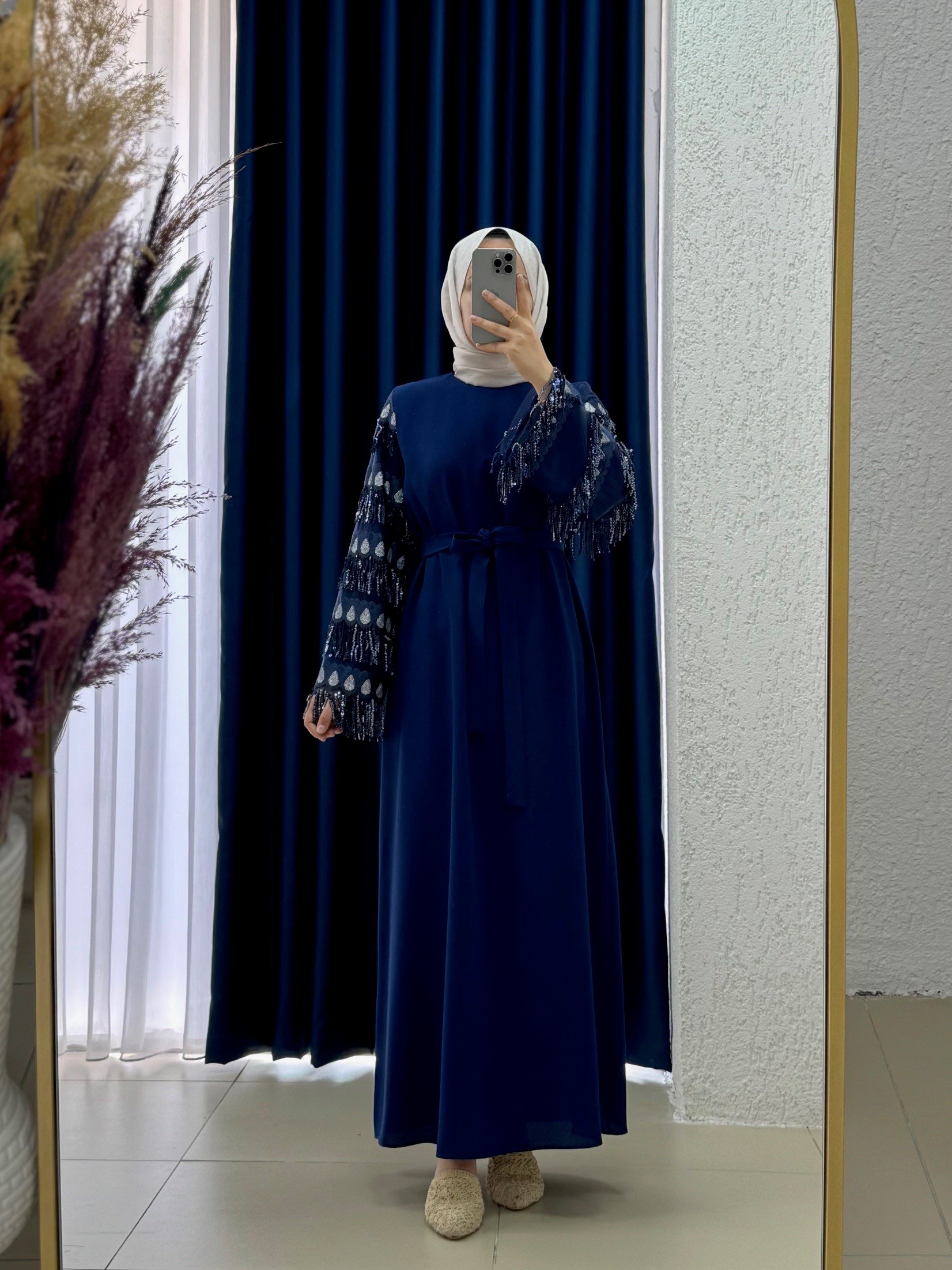 Orelilia Kolu Püsküllü Krep Elbise-PA9632 Lacivert