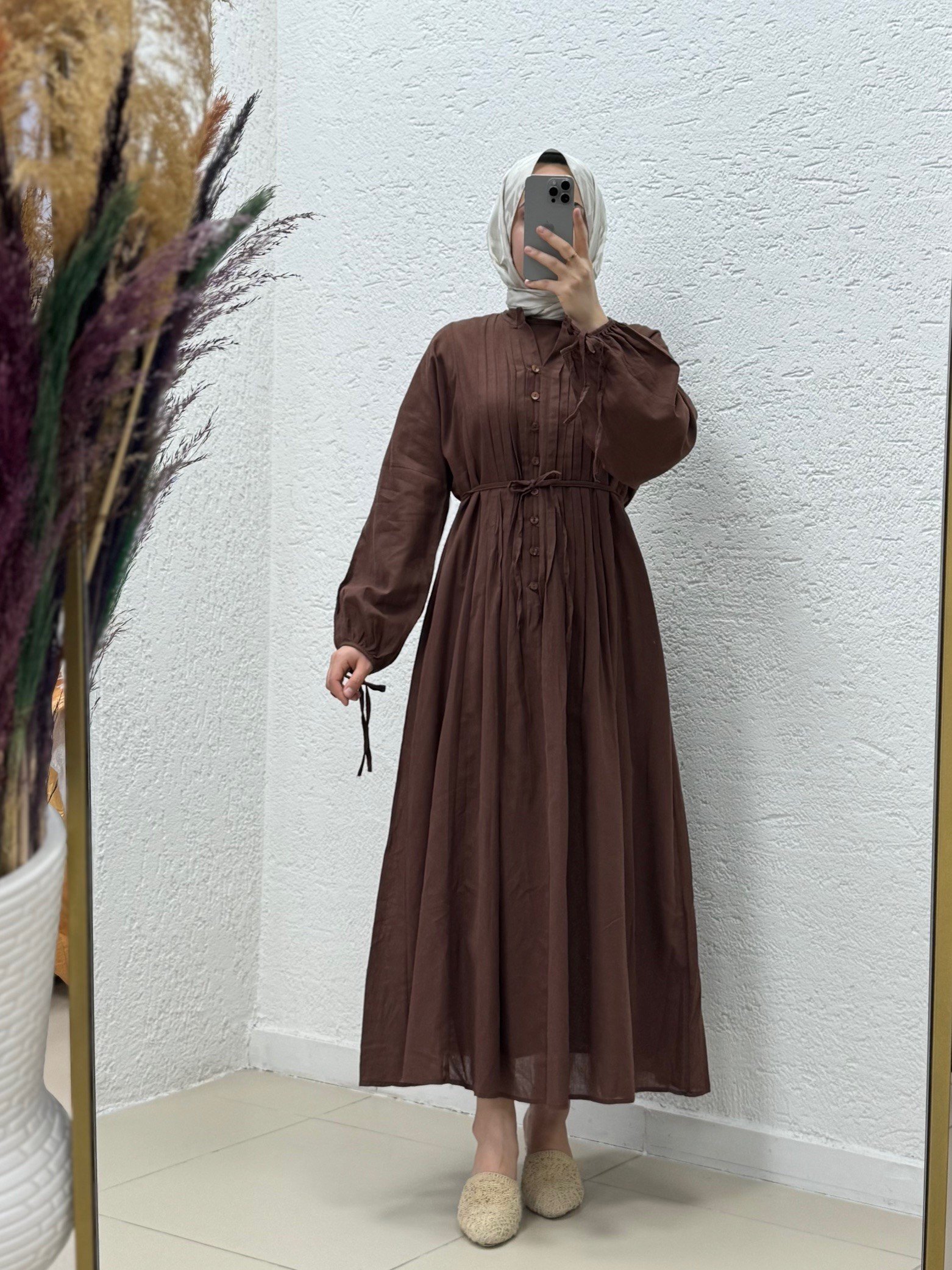Orelita Önü Düğmeli ve Pileli Elbiseli Takım-BN4449 Kahve