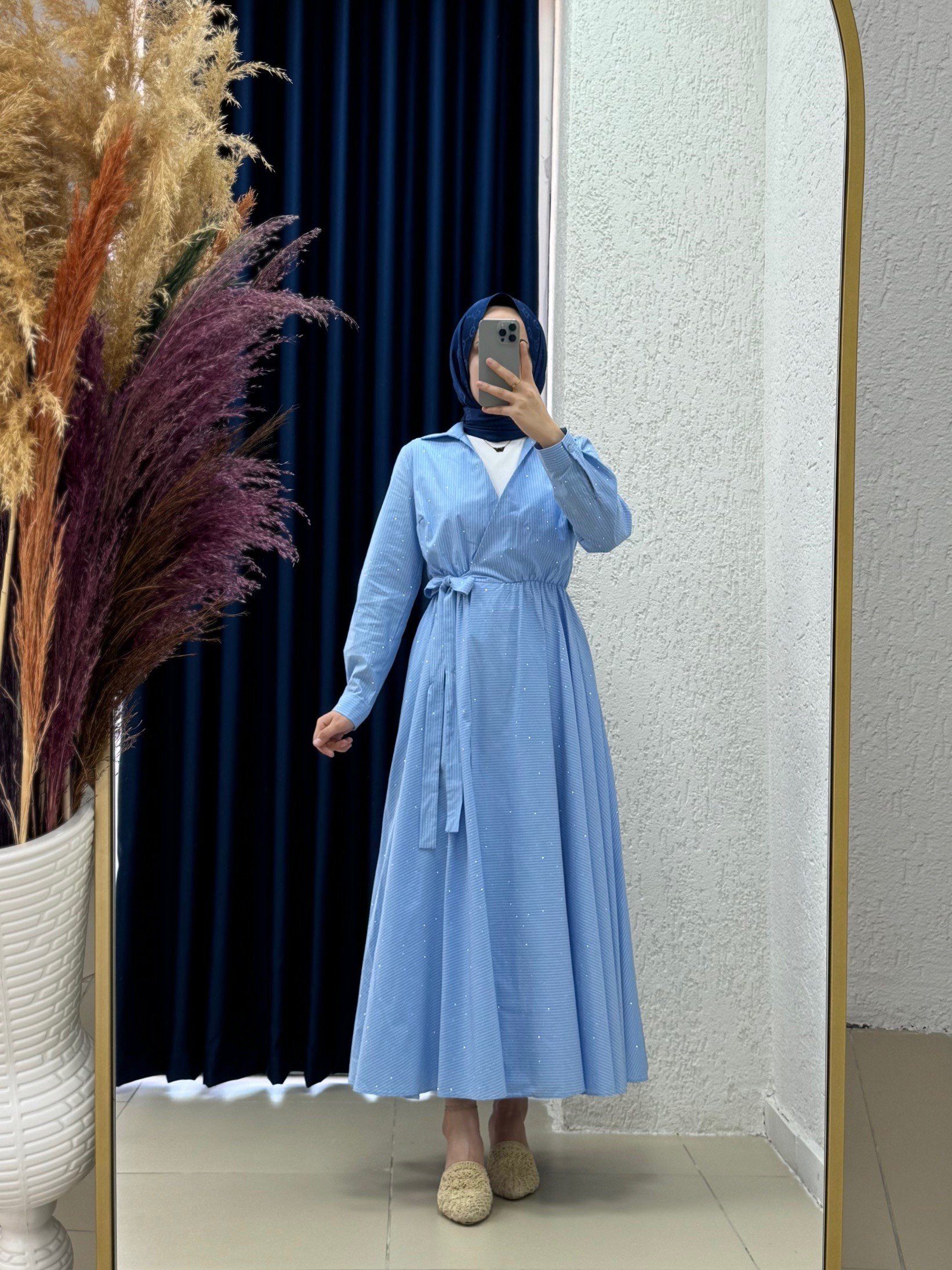 Ravuna Bağlamalı Çizgili Pırıltılı Elbise-BY91097 Mavi