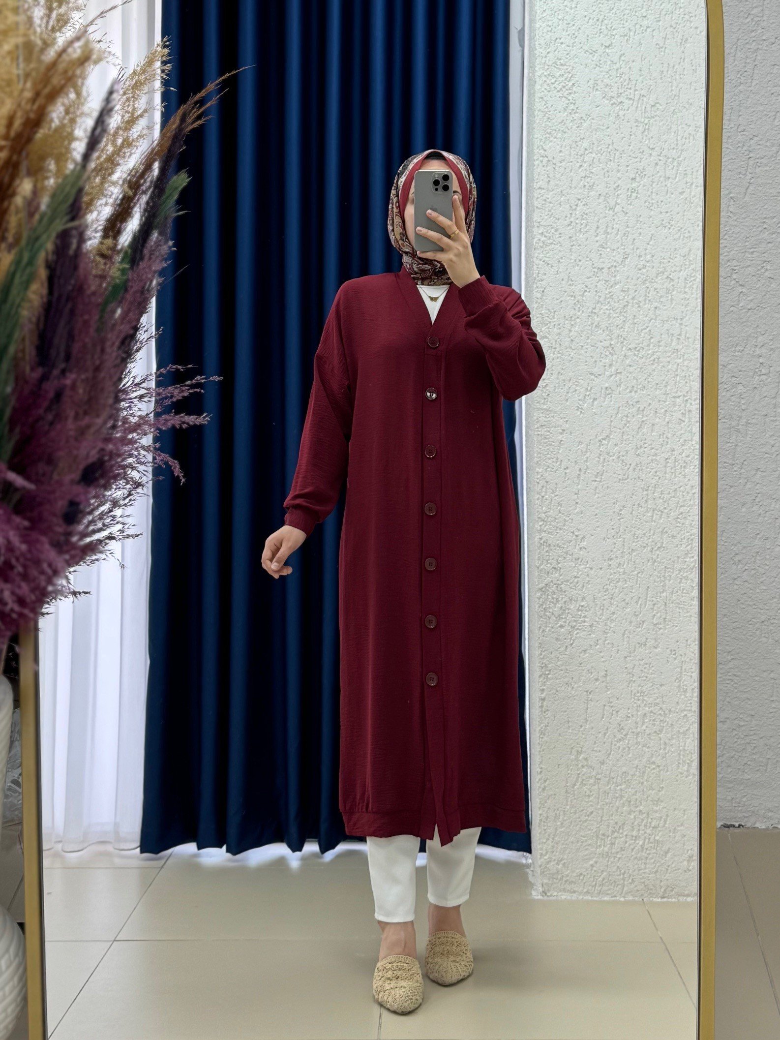 Serelle Önü Düğmeli Ayrobin Uzun Hırka-FA793 Bordo