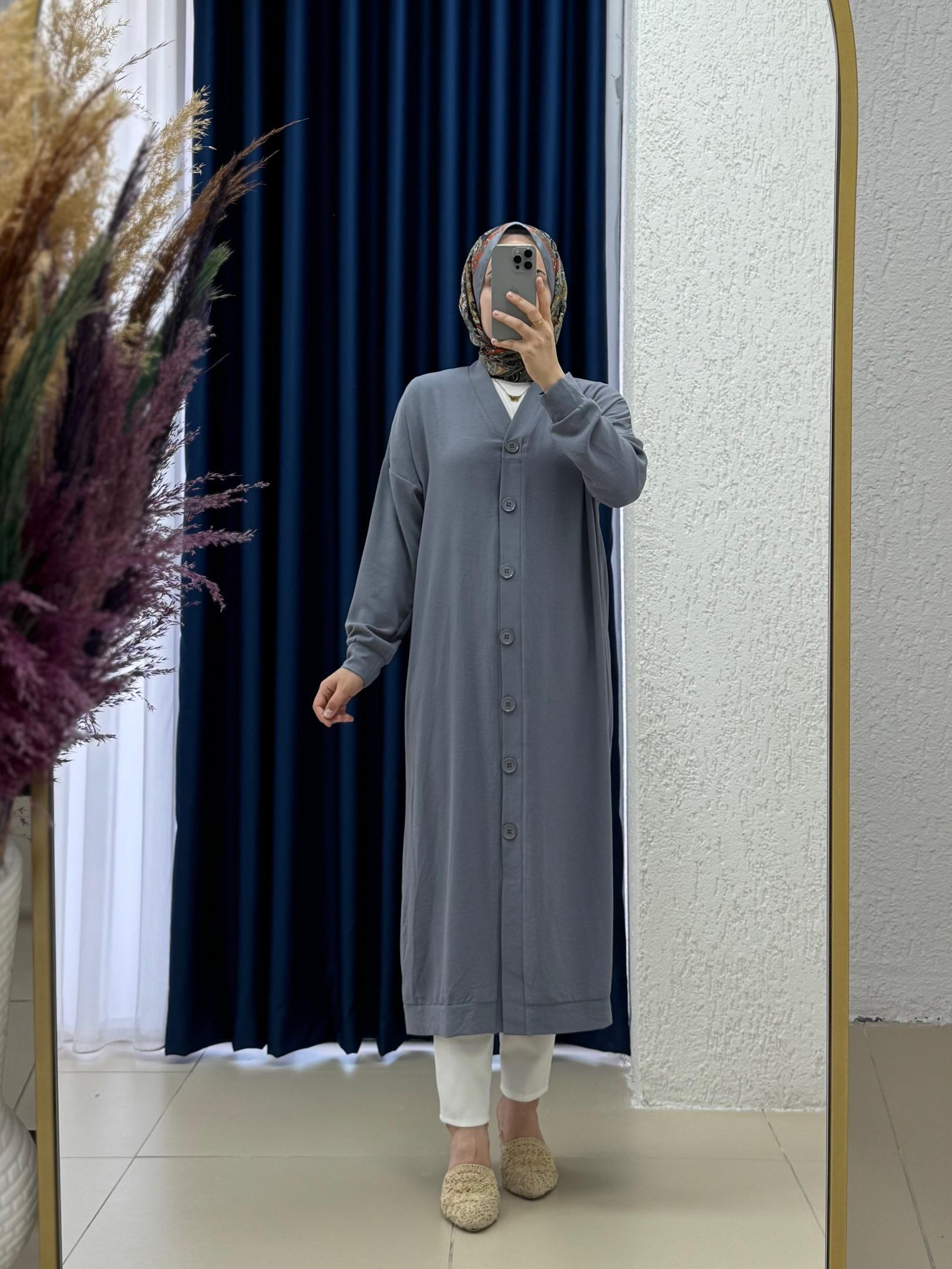 Serelle Önü Düğmeli Ayrobin Uzun Hırka-FA793 Gri