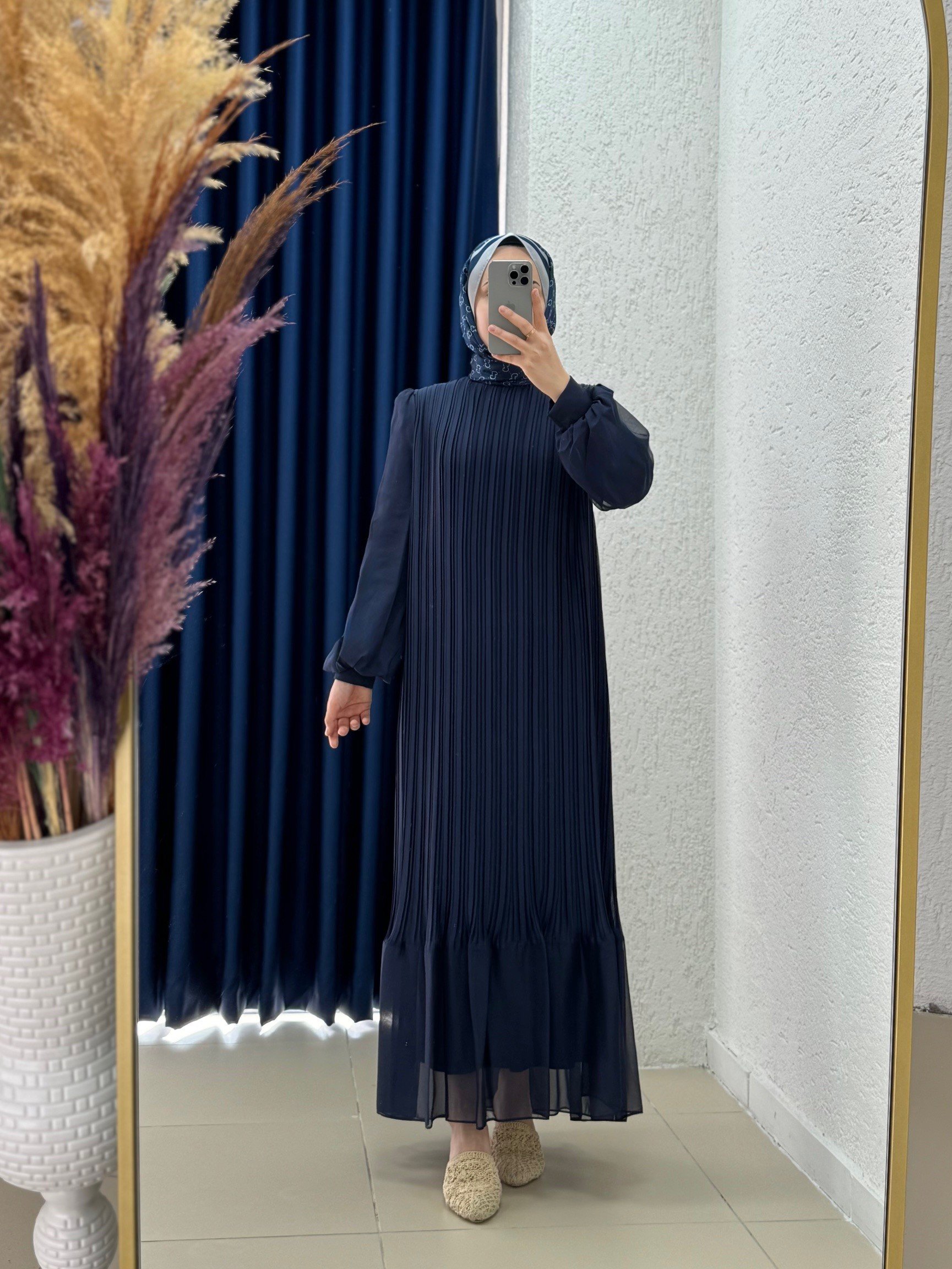 Seresia Balon Kol Piliseli Şifon Elbise-PA9390 Lacivert
