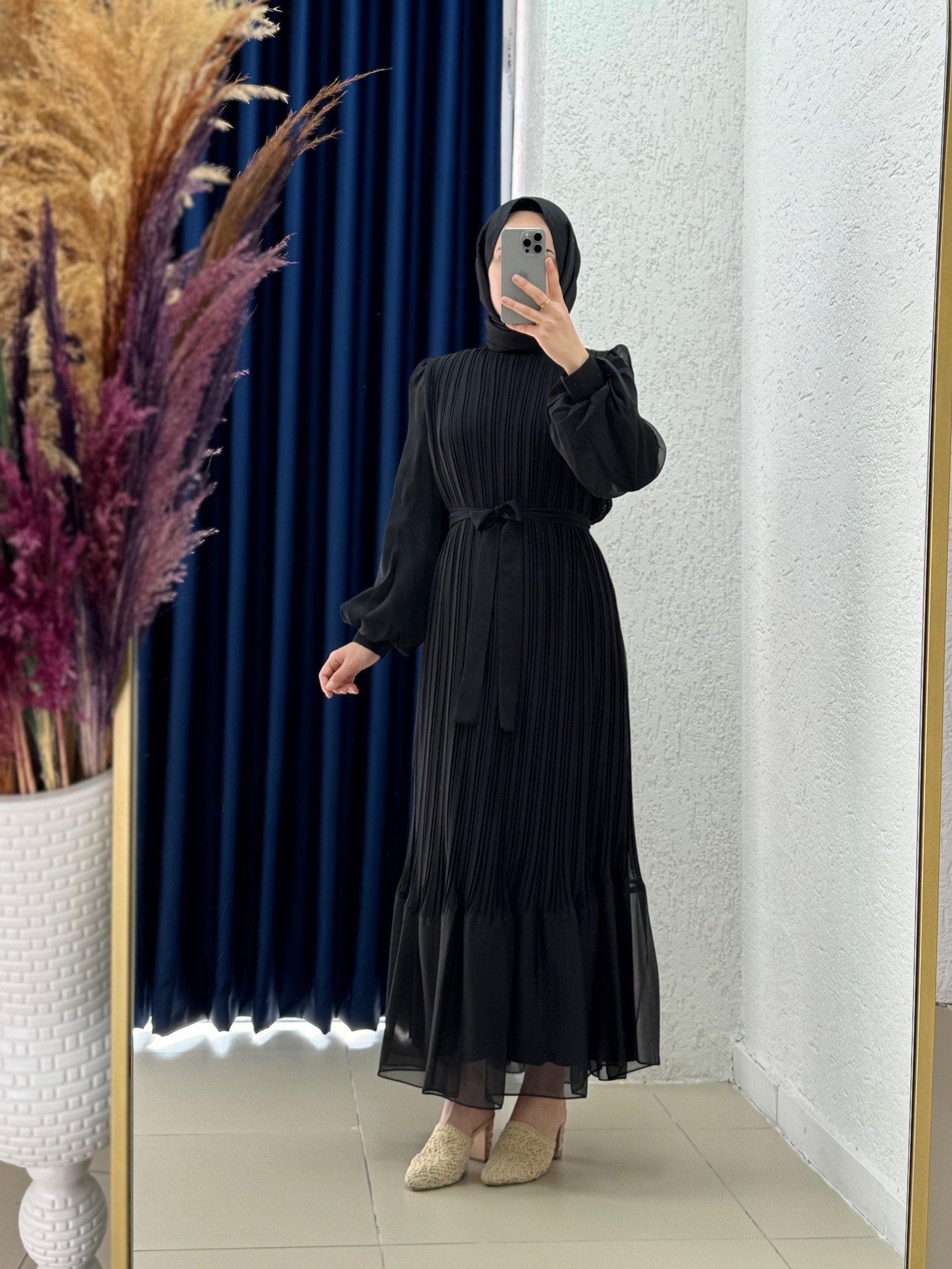 Seresia Balon Kol Piliseli Şifon Elbise-PA9390 Siyah