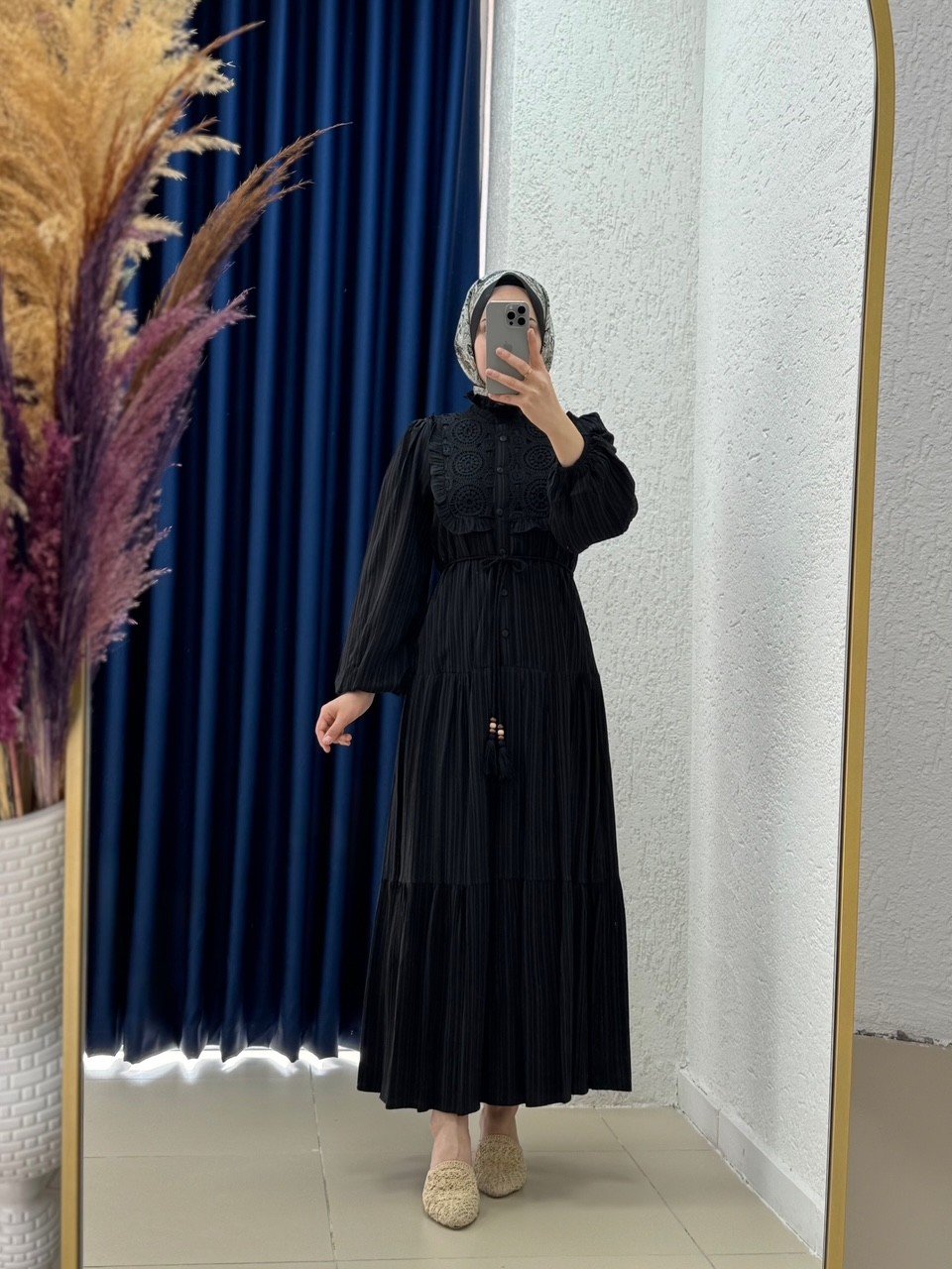 Sorina Önü Dantelli Katkat Detaylı Müslin Elbise-PA9505 Siyah