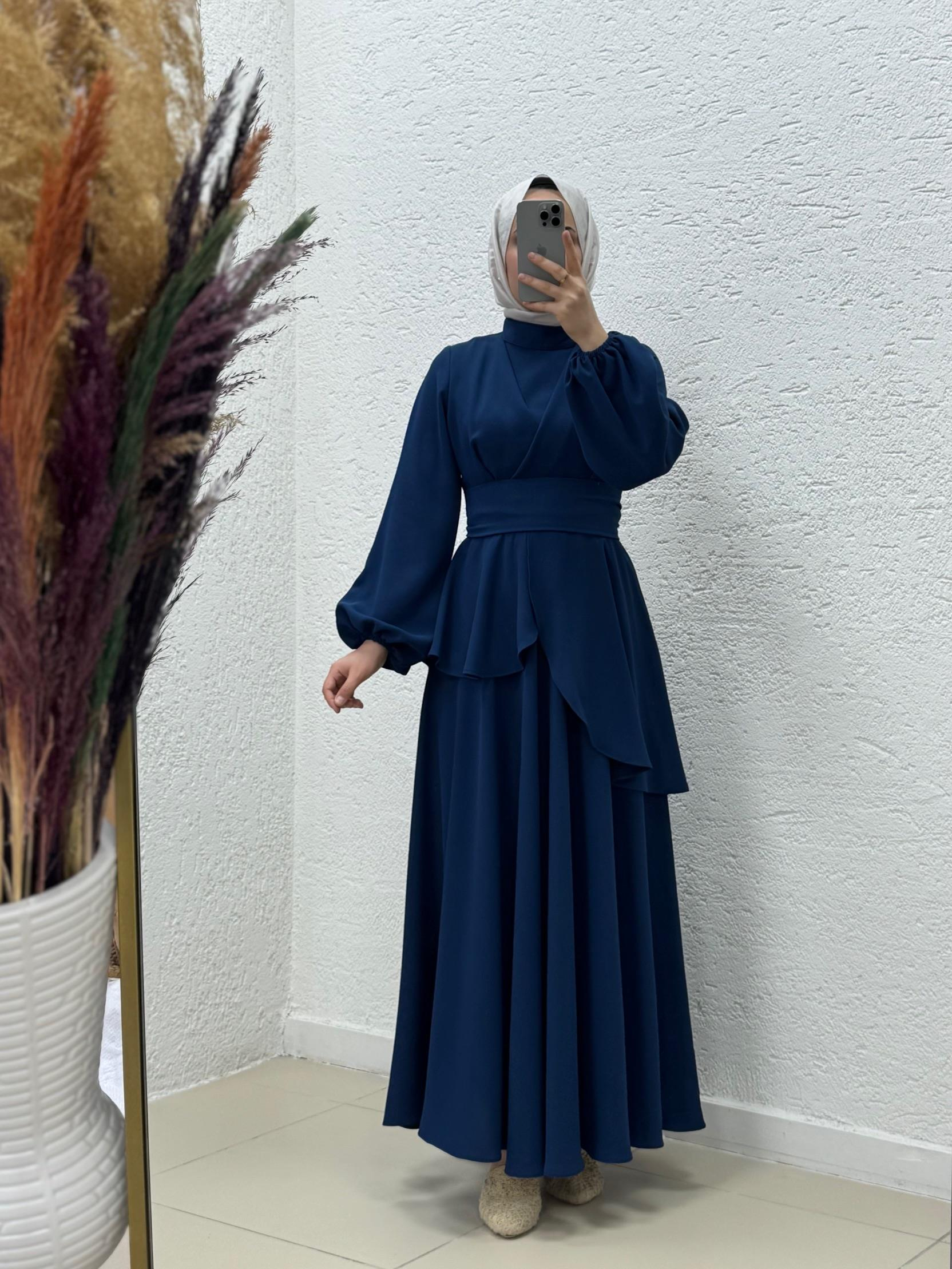 Tirona Etek Detaylı Krep Elbise-PA9646 Lacivert