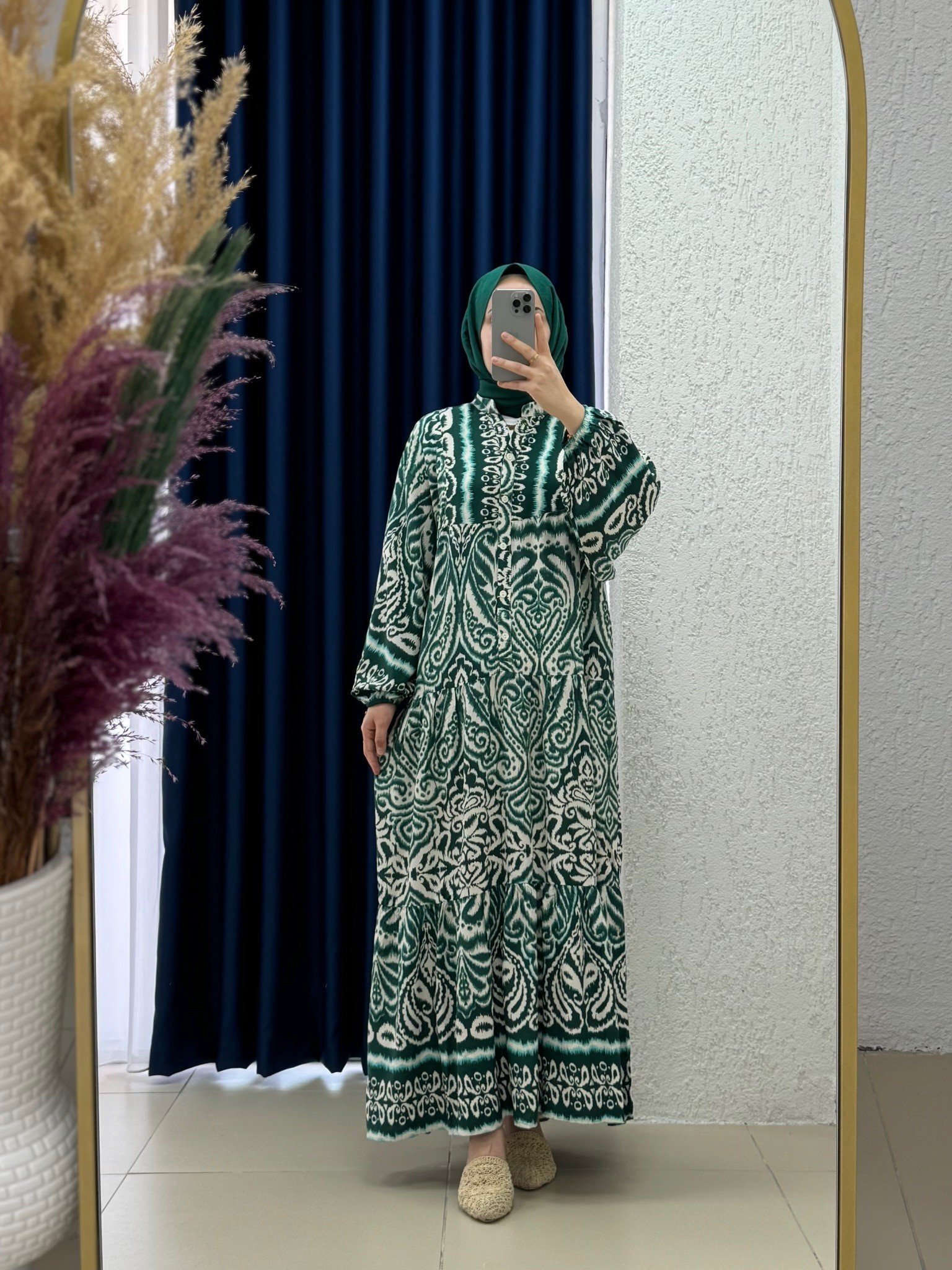Torino Otantik Desen Viskon Elbise-PE606 Yeşil