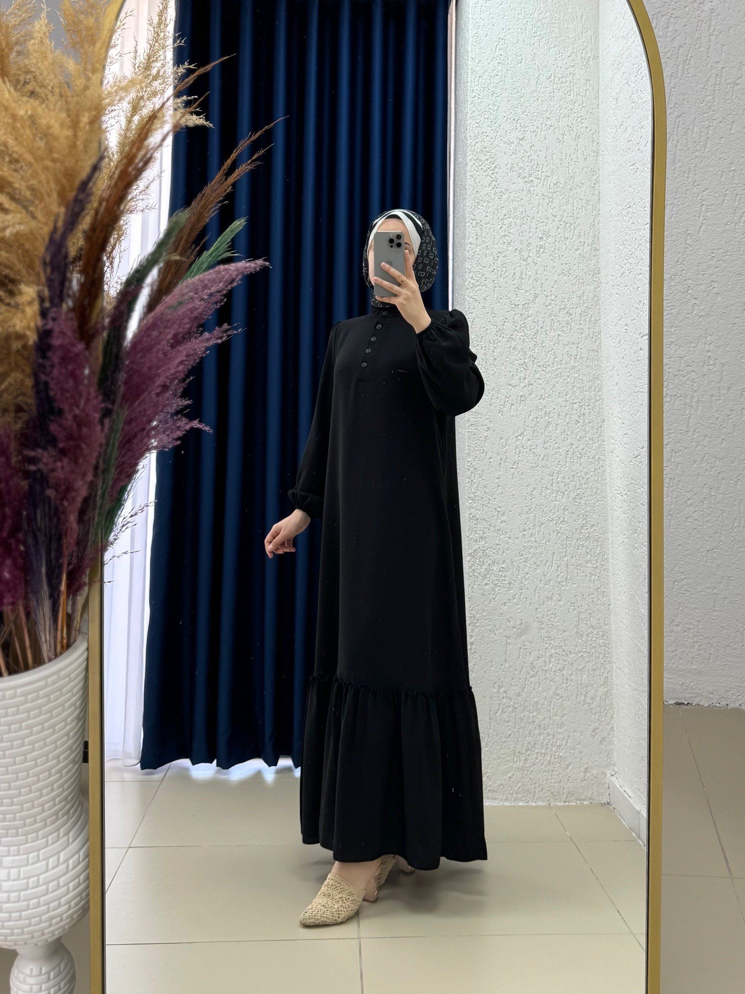 Vesira Göğüs Düğme Detaylı Etek Fırfırlı Krep Elbise-PA9215 Siyah