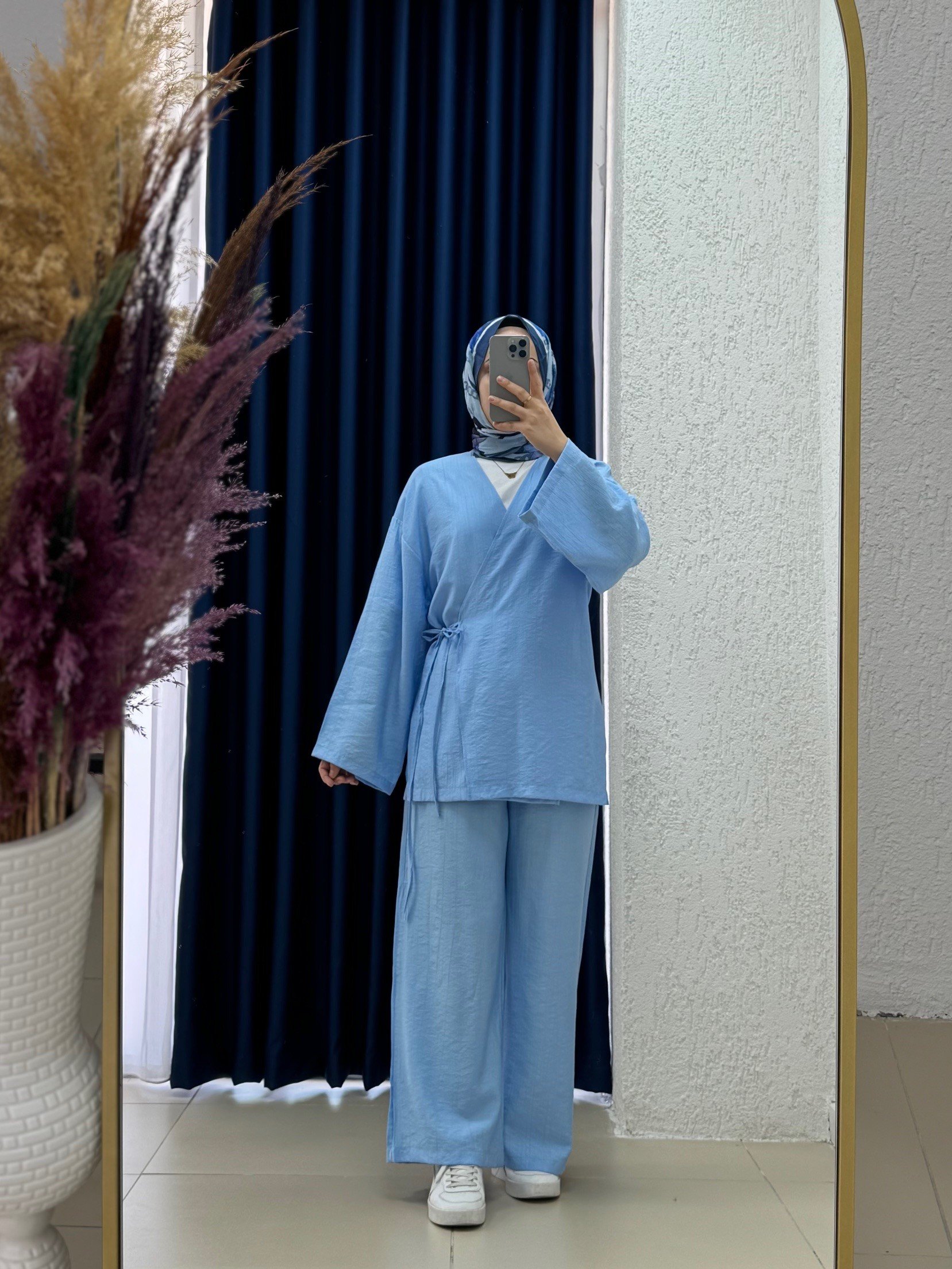 Vinmora Yandan Bağlamalı Kimonolu Çilek Pantolonlu Takım-EK544 Mavi