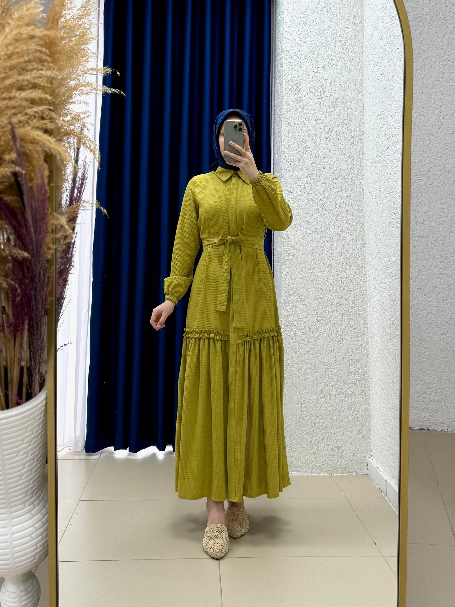 Vinyla Gizli Patlı Gofre Elbise-BY9766 Fıstık Yeşili