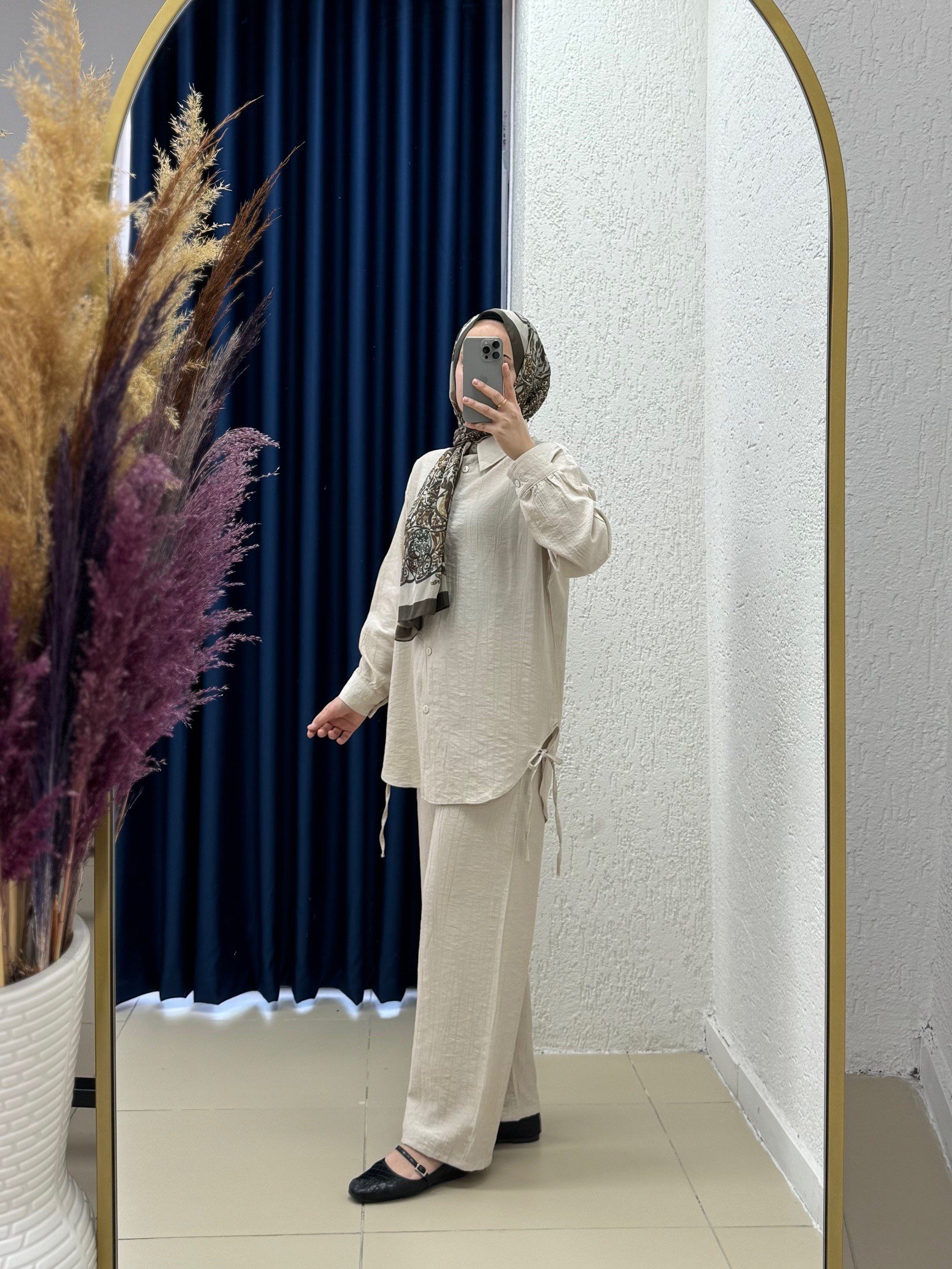 Yelita Yırtmacı İpli Çilek Pantolonlu Takım-MF462 Taş