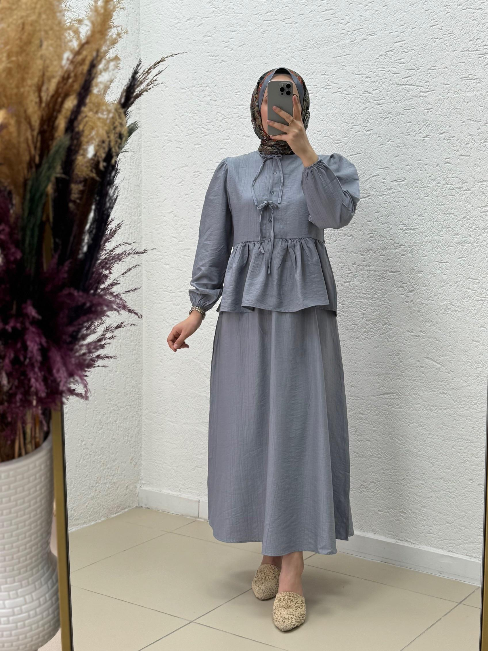 Zenira Çilek Etekli Biyeli Düğmeli Takım-NA3389 Gri