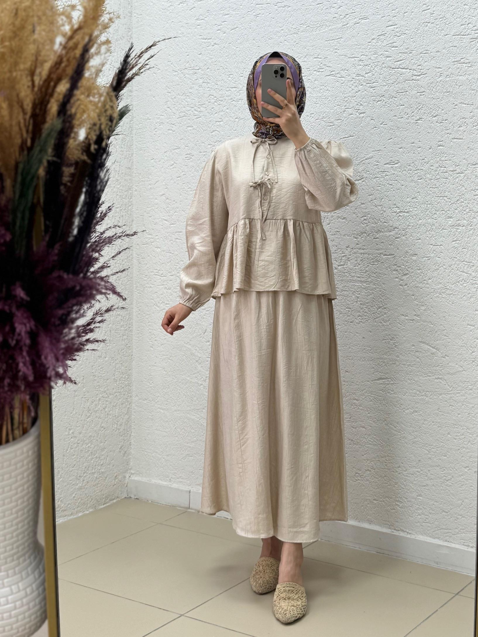 Zenira Çilek Etekli Biyeli Düğmeli Takım-NA3389 Taş